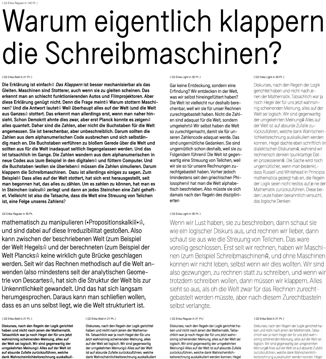 G2 Erika emerged from an early sketch for a semi condensed monospace typeface. It started out referencing historic typewriter lettering, but quickly moved on to something new. Early versions of G2 Erika were used for a number of personal projects (e.g. the gruppo-due.com system font). Through this extended use and testing phase we gradually polished, adapted and expanded G2 Erika to arrive at a sturdy typeface ready for heavy work.